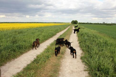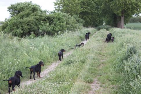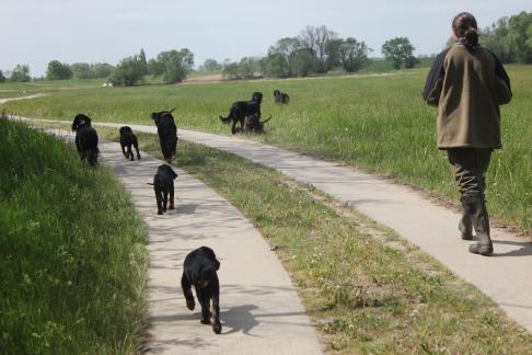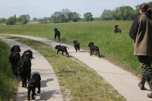 So, nun geht es auf den Endspurt zu. Am vergangenen Sonntag war die Zuchtwartin bei uns und hat alle Welpen eingehend begutachtet, sie wurden als optimal aufgezogen und gesund beurteilt, darüber freue ich mich sehr. Am 1. Mai werden uns die ersten Welpen verlassen um in ihren neuen Familien für Abwechslung und Freude zu sorgen. Trotz des sehr unschönen Wetters gehen wir täglich mit dem ganzen Rudel Welpen spazieren. Unter A-Wurf eine kleine Auswahl Fotos von der gestrigen Reviererkundung bei grausigem Wetter.( Wir hatten etwas Glück und haben eine Regenpause erwischt!)