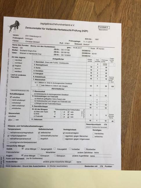 Bonny von den Huntewiesen hat am 07.04.18 im Verein für Pointer und Setter e. V. in der LG Berlin Brandenburg/Mecklenburg Vorpommern ihre erste Prüfung mit gut 9 Monaten super bestanden. JuS mit 69 Punkten. Ich freue mich riesig!!