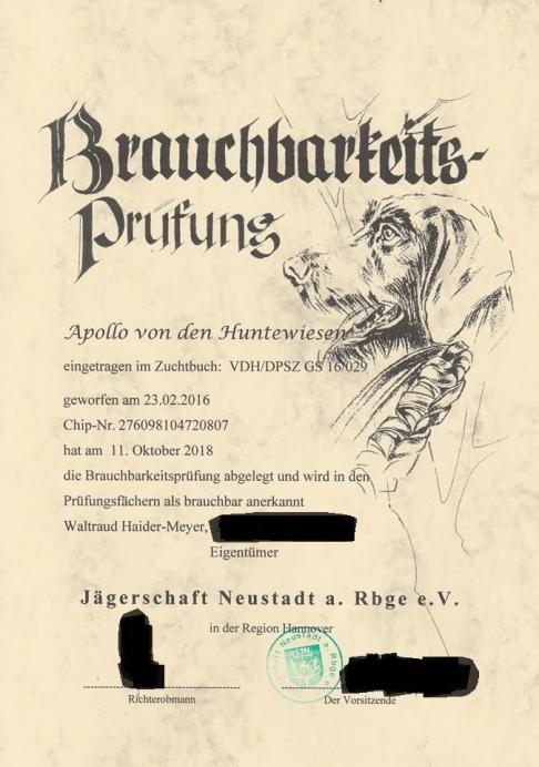 Apollo hat am 11.10.2018 die Brauchbarkeit bestanden, unsere herzlichen Glückwünsche an Herr und Hund E>!! Schön das Ihr glücklich miteinander seid. Auf viele gemeinsame Jagdjahre!!! |
