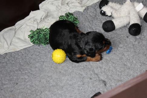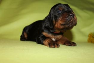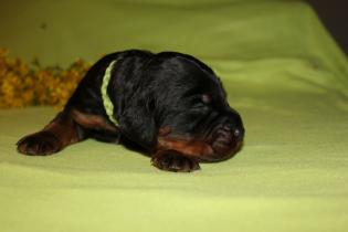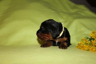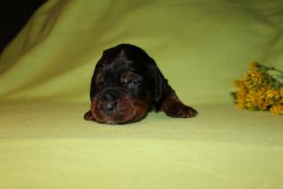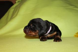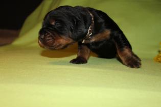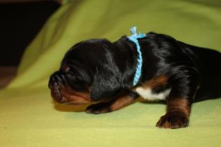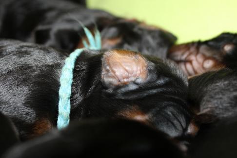Hier nun die ersten Einzelfotos von unserer super quirligen Welpenschar. Die Entwicklung geht nun mir riesigen Schritten voran, sie bellen und knurren ein wenig, laufen schon ein paar Schritte und erkunden Wurfkiste und Geschwister. Es ist so schön mit anzusehen! An der Seite der kleine Rüde mit dem blauen Halsband, er ist zur Zeit der aktivste der Truppe.
