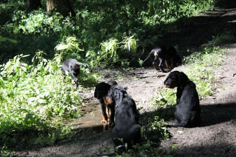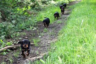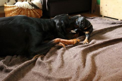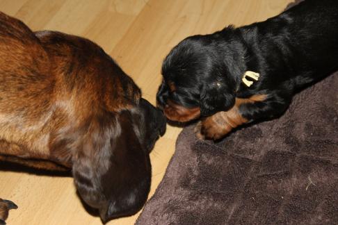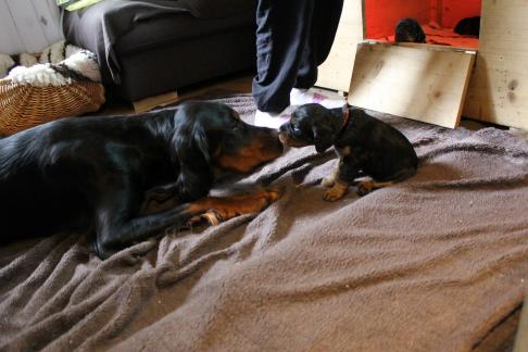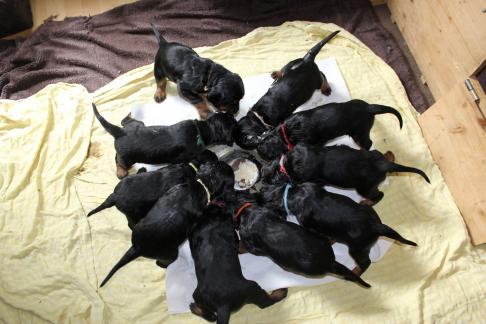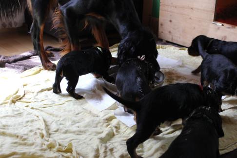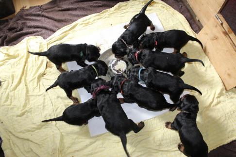 Vor 3 Tagen gab es die erste "feste" Nahrung, eine ziemliche Sauerei, aber es wird von Tag zu Tag besser. Eve ist darüber sehr erleichtert, denn das Säugen der mit Zähnen und Krallen bewaffneten Welpen ist für sie kein Vergnügen mehr. Um so mehr freut sich Halbschwester Audrey über den immer agiler werdenden Trupp, sie liebt es mit ihnen zu spielen, nach dem Essen "aufzuräumen" und sie zu umsorgen. Auch unsere Hannoversche Schweißhündin Roxi stattet den Welpen immer Mal wieder einen Besuch ab.