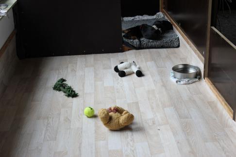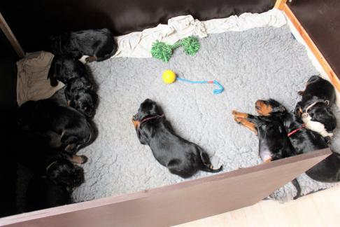 Heute werden die Welpen schon 4 Wochen alt, ihr Aktionsradius wird größer und sie sind nun vom Wohzimmer in den Wintergarten umgezogen, jetzt habe sie mehr Platz und können von hier aus, wenn es zu regnen aufhört, den Garten erkunden.